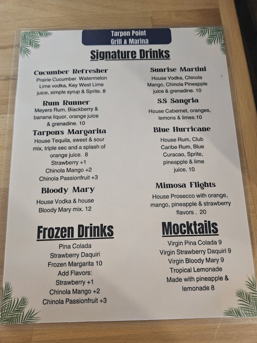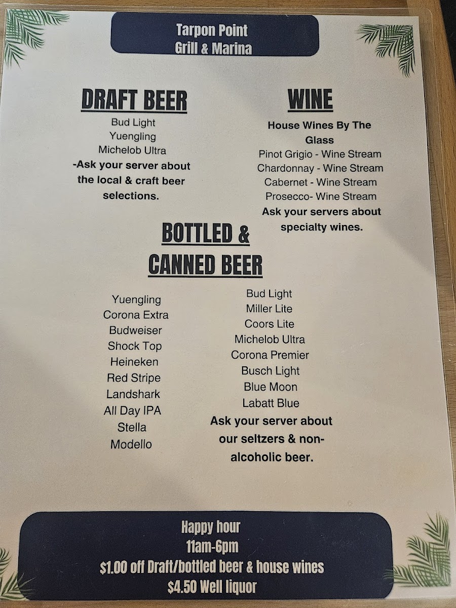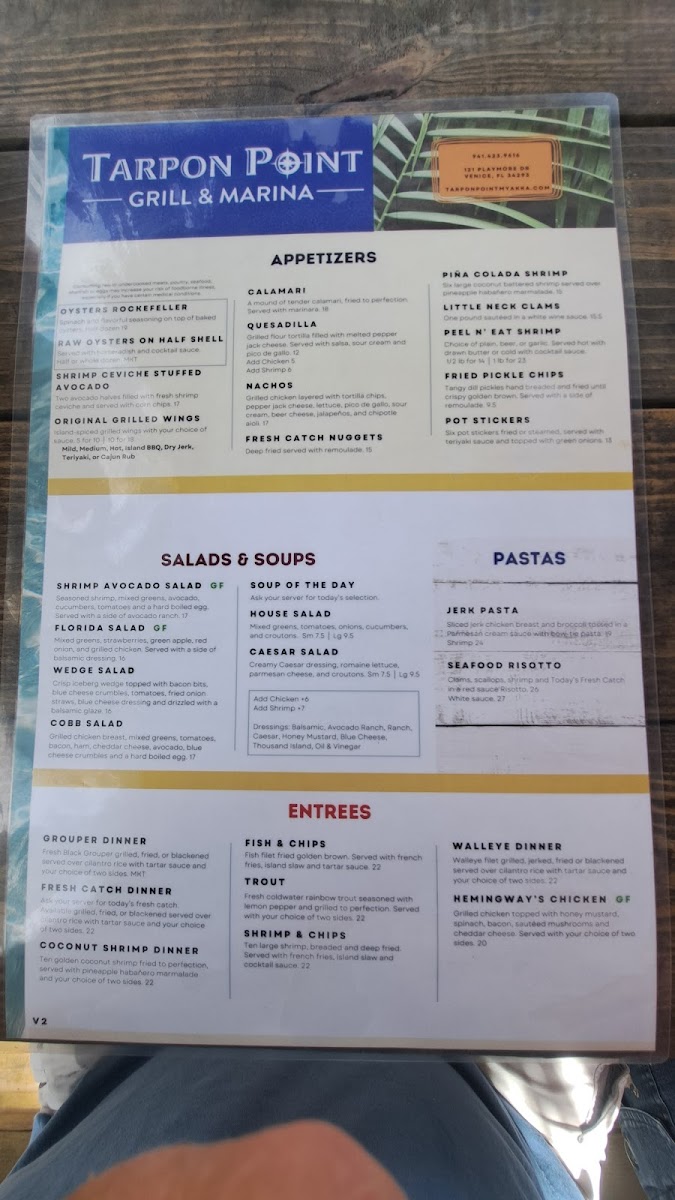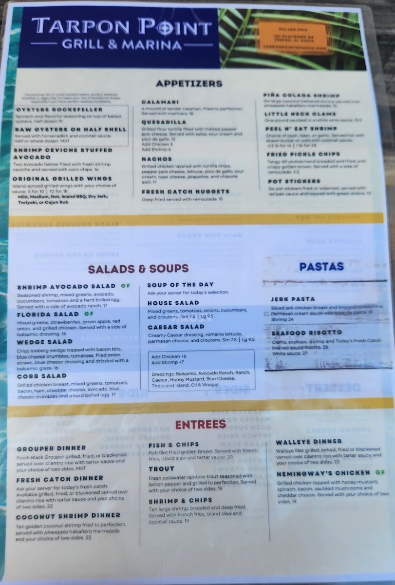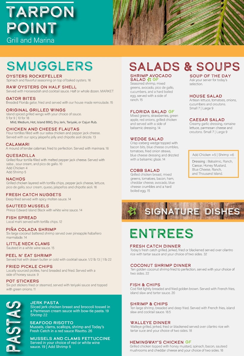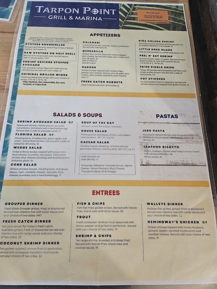 If you're in the mood for fresh, flavorful dishes with a side of scenic views, look no further than Tarpon Point Grill And Marina Menu. Nestled at 121 Playmore Dr, North Port, FL, this local gem offers a laid-back atmosphere perfect for enjoying good food and great company. Whether you're craving a delicious seafood platter, a juicy steak, or something lighter, their diverse menu has something to satisfy every palate. With ingredients sourced fresh and prepared to perfection, each dish reflects the coastal charm of the area. Whether you're stopping by for lunch or a dinner by the water, the menu is designed to please and impress with every bite. If you're visiting, be sure to try their signature items that bring the essence of Florida straight to your table, all while you enjoy the relaxing marina vibes.